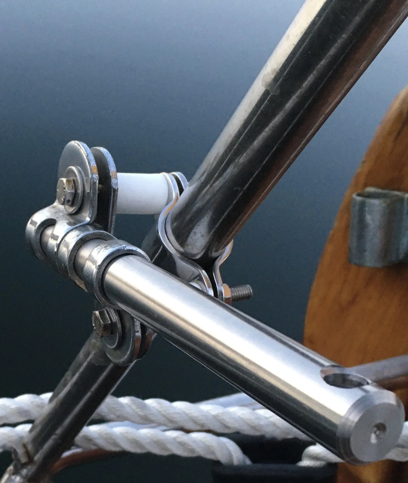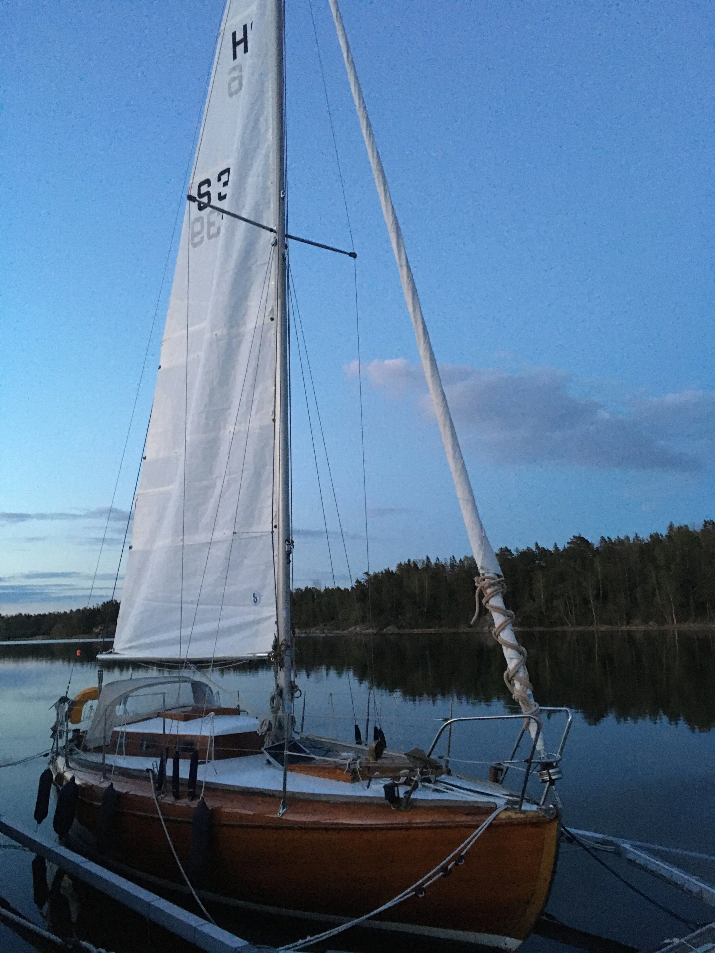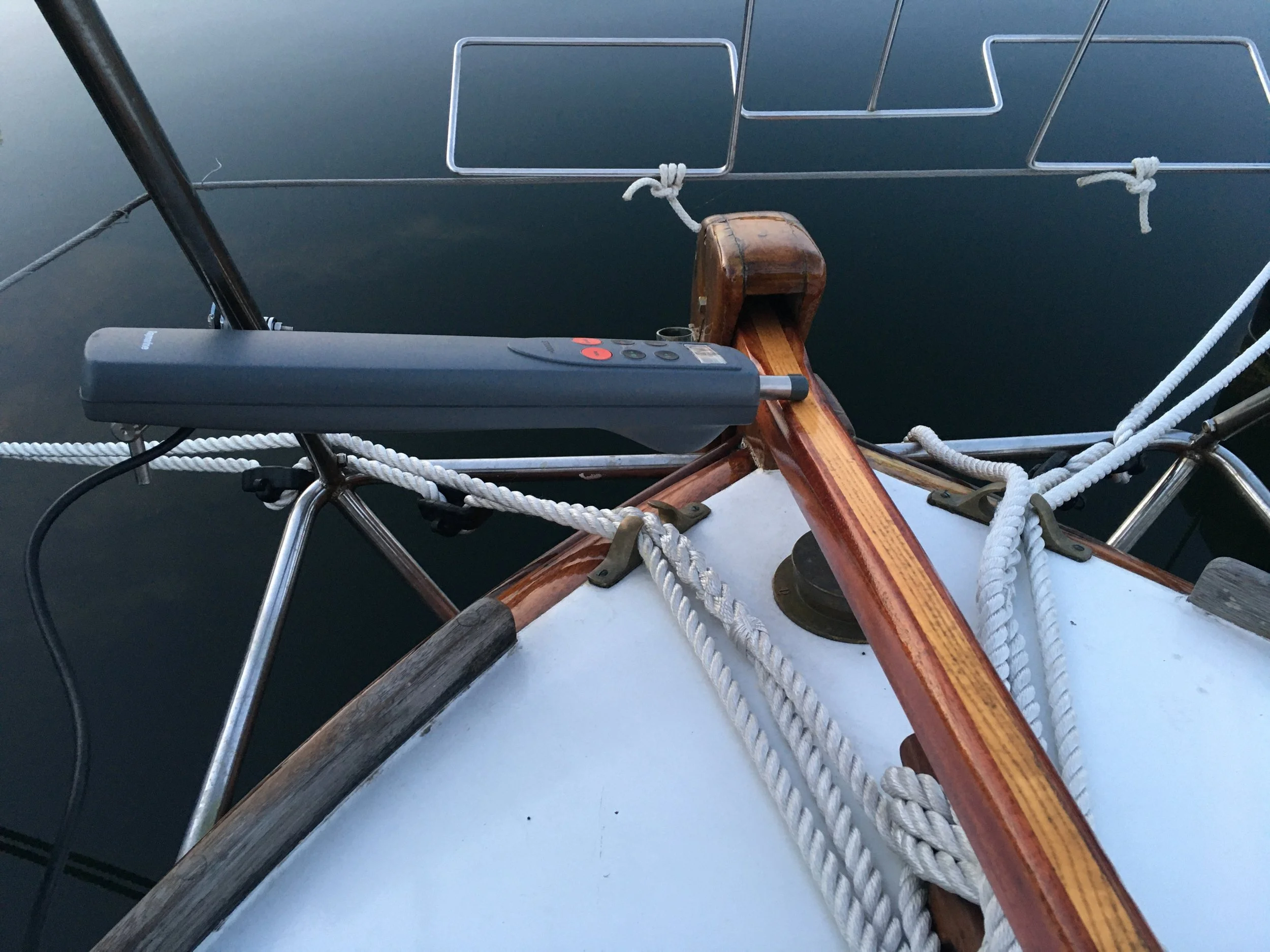 Calm evening: mainsail rigging, autopilot mount
