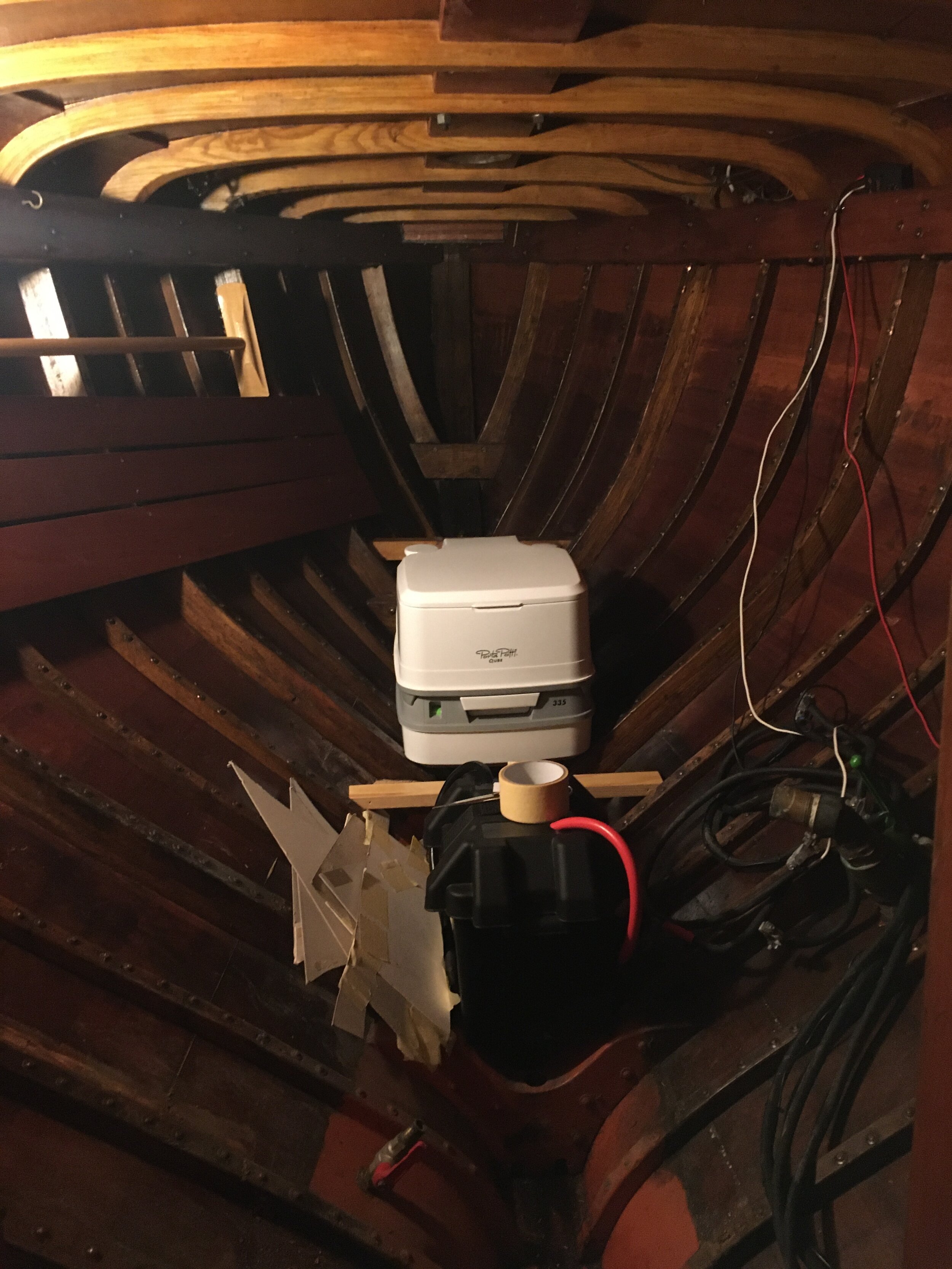 While chatting with Jim I was trying to find optimal place for chemical toilet. The best privacy on my small boat is behind the bulkhead but this placement seems to be awkward.