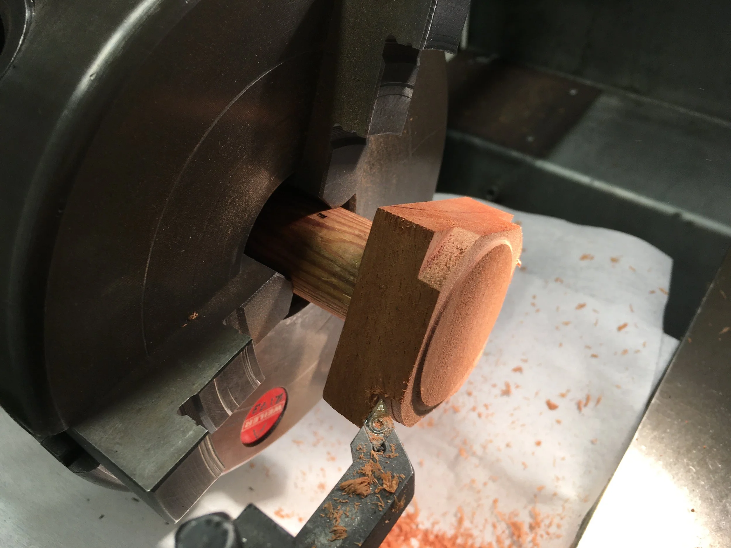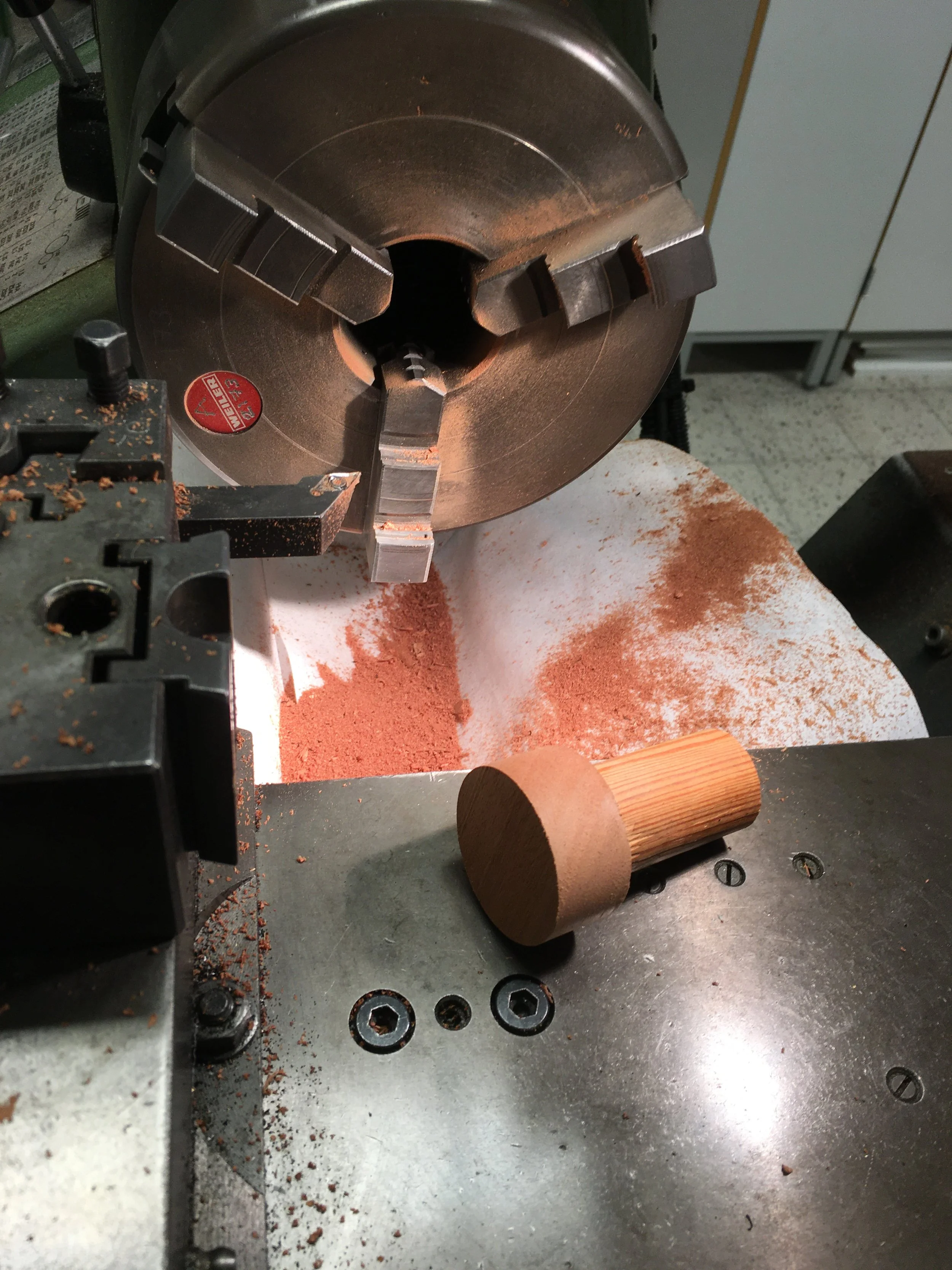 The biggest hole, left after output valve, is too big to find ready-made bung on the market. I make my own on the lathe - gluing a rounded piece of pine as a grip, to clamp it on the lathe.