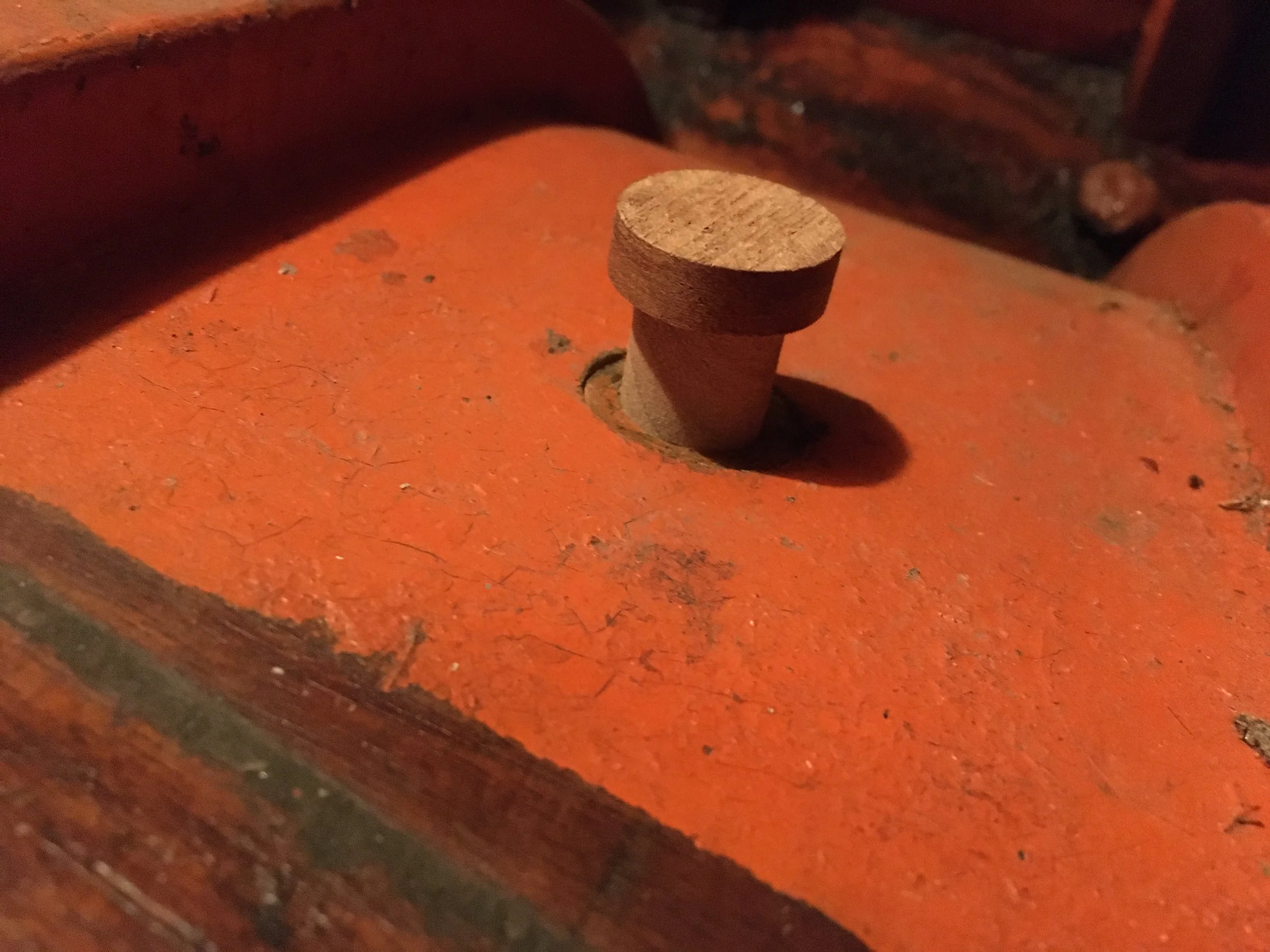 After I file hole edges, to clean red lead residues and expose fresh wood, the bung will fit snugly, leaving enough room for epoxy.