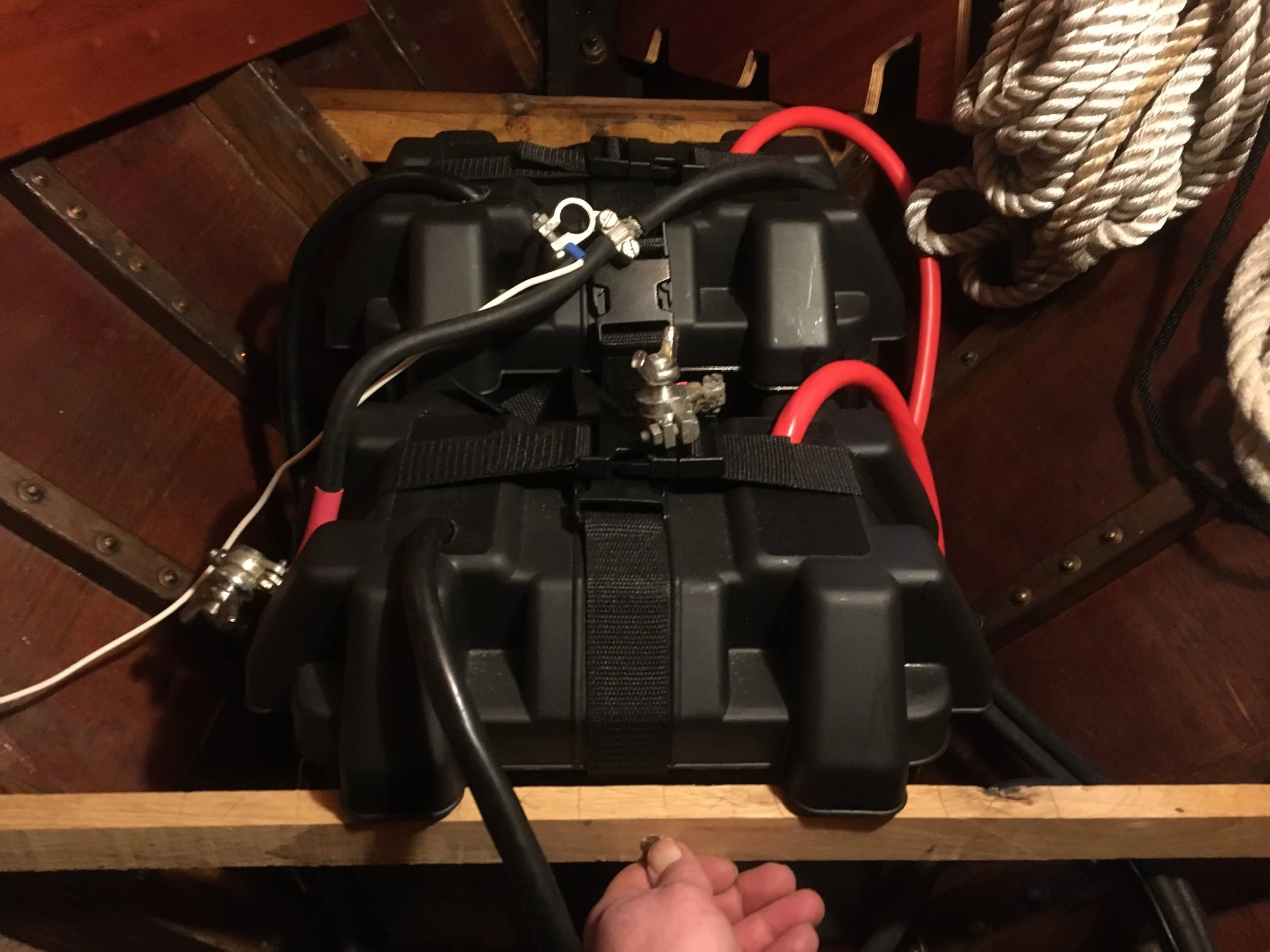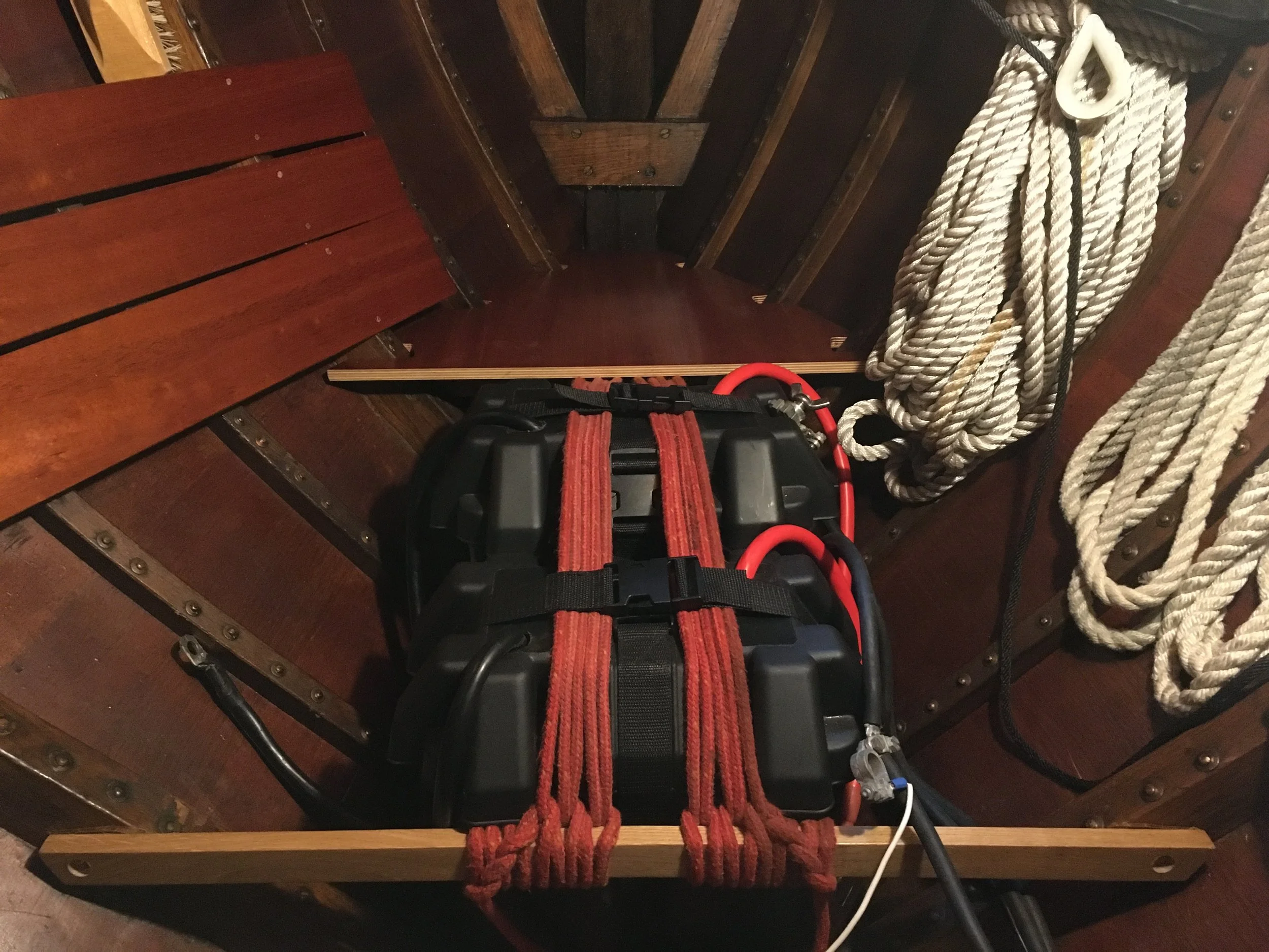 Thick silicone-bronze screws hold it steady towards thick, laminated frames. More than enough for both batteries to stay in place. I lashed them tightly in place. It ain’t go nowhere!