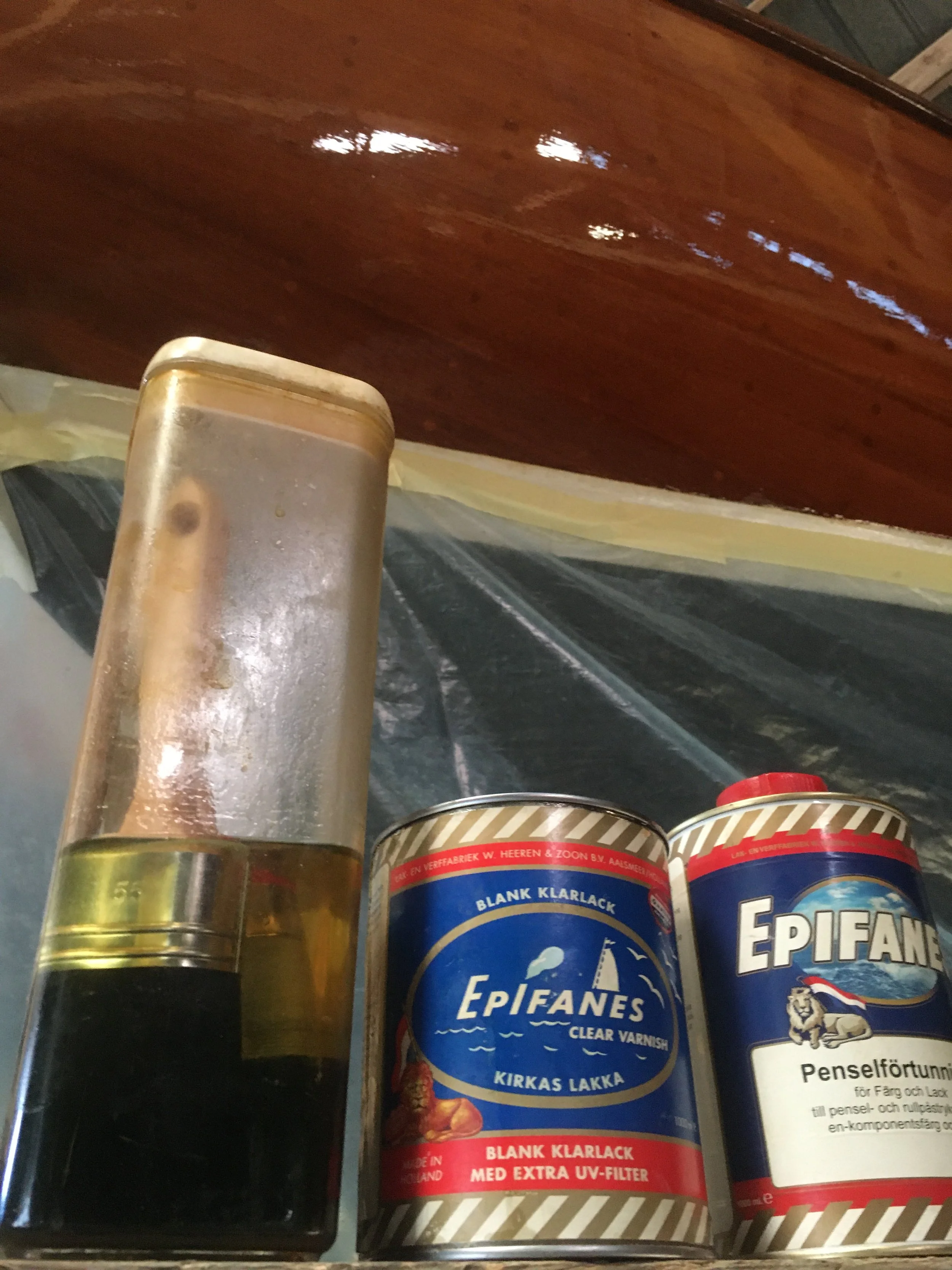 Finally! My favorite part of spring maintenance - varnishing. I really mean it, I enjoy varnishing, especially when it goes smooth. What I don’t like is all preparations for varnishing: abrading/keying the surface, vacuuming, de-greasing etc.