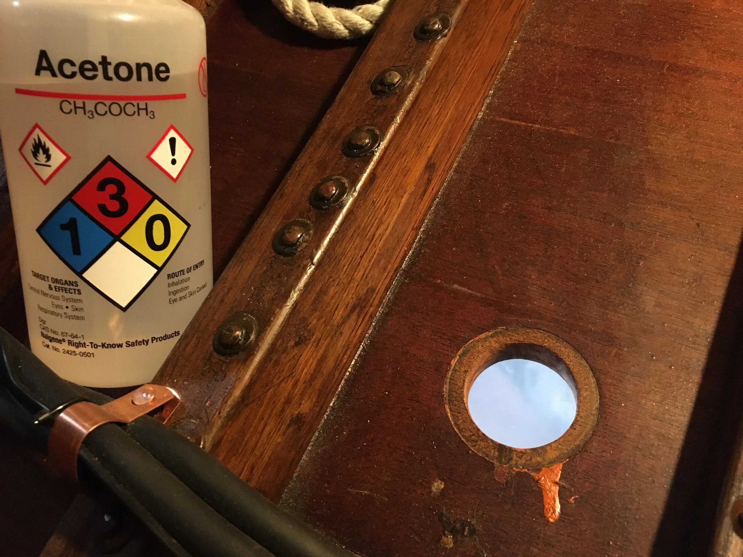 Before these place are screwed I need to glue wooden plugs to close unused through-hull openings. There are three such places: two after removed marine toilet and one after removed mechanical log.