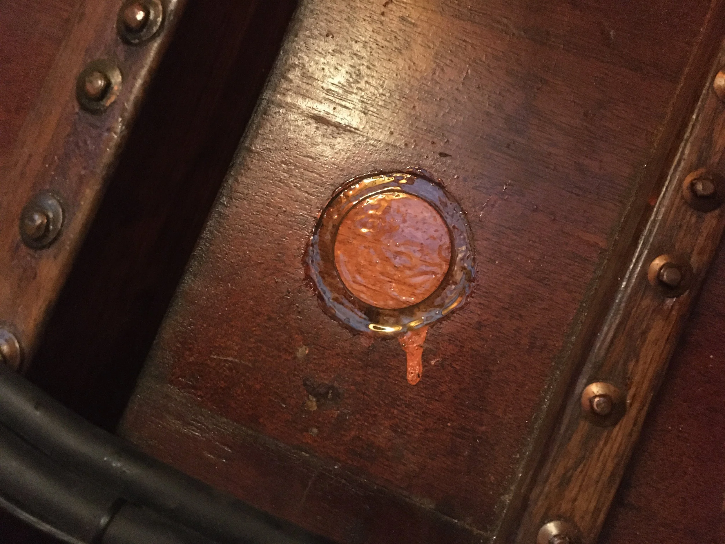On the inside, as additional protection should the epoxy fail, I screw thick copper plates on top of glued bungs. Additional sealing with Ettan. I considered spreading Sika instead, which would act as glue and sealer, but decided to go just with Ettan. Bronze screws are holding very well, copper is thick and I don’t expect the epoxy bond to fail so why mess with Sika.
